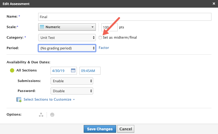En Schoology, puede establecer una prueba/cuestionario, una tarea, una evaluación o un foro con calificación como un parcial o final. Si establece un elemento como parcial o final, se modifica la forma en que el elemento aparece en la libreta de calificaciones, así como la forma de calcular la calificación en el curso.
