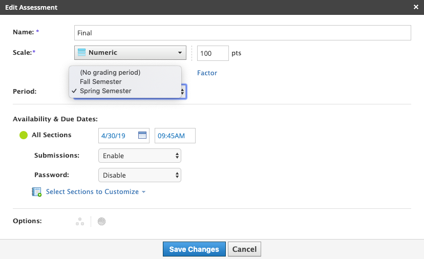 Ponderar calificaciones en relación con todos los períodos de evaluación: al crear o editar el elemento, seleccione Ningún período de evaluación junto a Período para que la calificación se tenga en cuenta en la calificación general del curso.