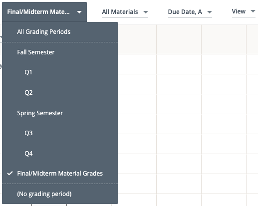 Para visualizar y editar las calificaciones de un parcial o final, configure el período de evaluación y elija Calificaciones de los materiales finales/parciales en la libreta de calificaciones.