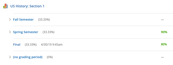 Las calificaciones parciales y finales se mostrarán en el informe del alumno exactamente como aparecen organizadas en Configuración de calificaciones. Si las calificaciones se ponderaron en relación con los subperíodos de un período de evaluación, estas aparecerán como un subperíodo dentro del período de evaluación. Si las calificaciones se ponderaron en relación con otros períodos de evaluación del curso, estas aparecerán como un período de evaluación.