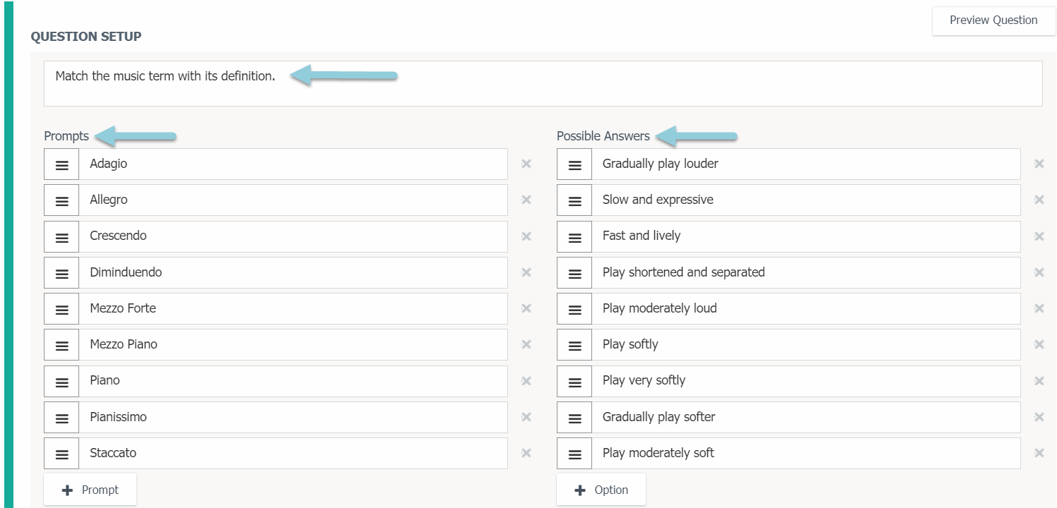 Cada término ingresado en la columna Indicación en Configuración de preguntas aparecerá automáticamente en la columna de la izquierda en Configuración de respuestas correctas. Deslícese hacia abajo para verificar que todos los términos ingresados en la columna Respuesta posible en Configuración de preguntas aparezcan en la parte inferior de las dos columnas en Configuración de respuestas correctas.