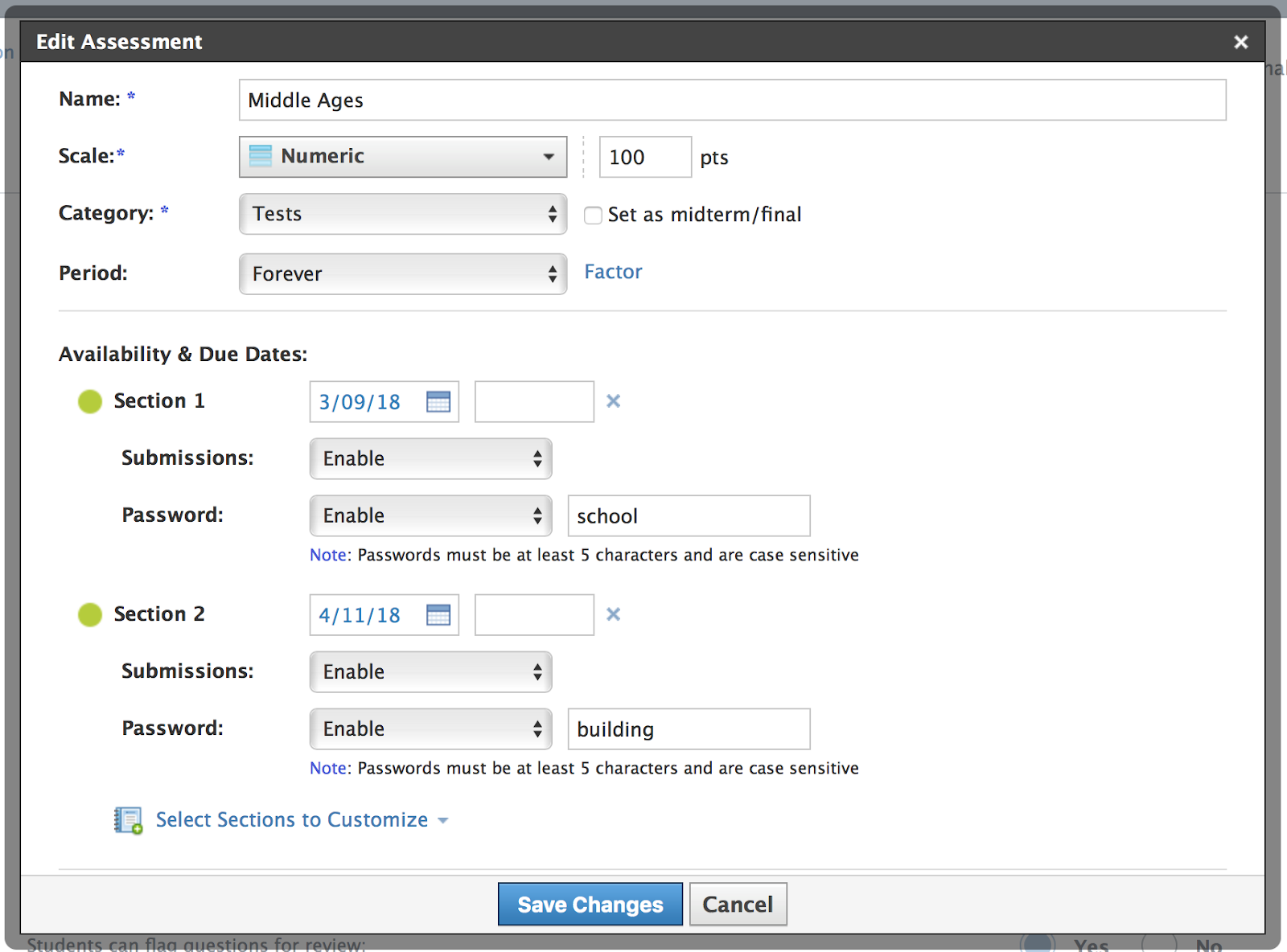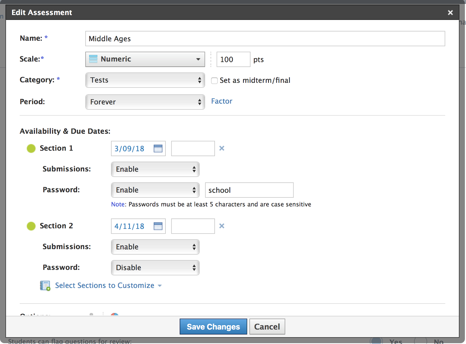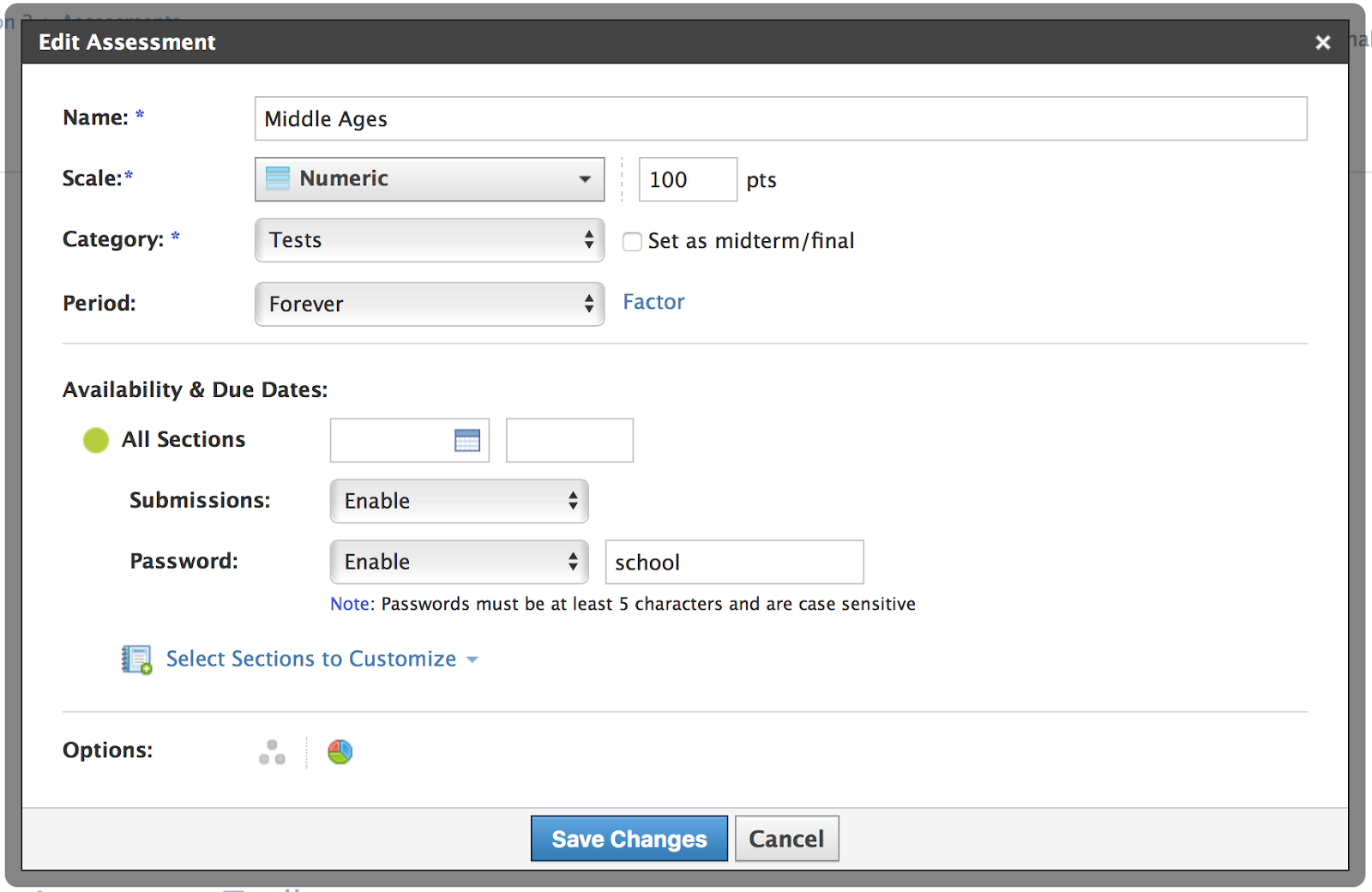 Los instructores con secciones vinculadas pueden controlar la contraseña de la evaluación para cada sección. La configuración de la contraseña en secciones vinculadas funciona de la misma manera que la configuración para habilitar o deshabilitar entregas.