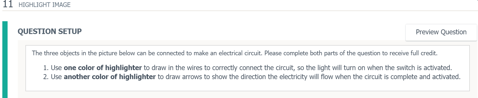 Utilice la pregunta en la que se debe resaltar la imagen para permitir que los alumnos dibujen sobre la imagen. El tipo de pregunta en el que se debe resaltar la imagen es eficaz en muchos escenarios de prueba, como en los casos en los que se deben resaltar partes de una imagen (huesos en un esqueleto o elementos específicos de la tabla periódica, por ejemplo). Este tipo de pregunta no puede calificarse automáticamente.