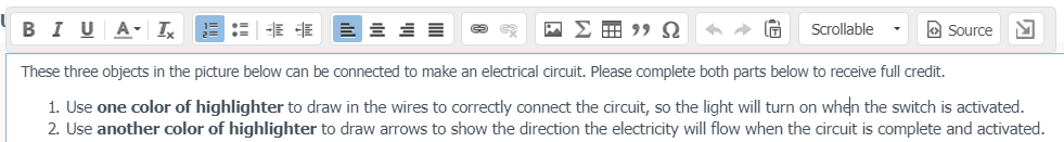 Use el Editor de texto enriquecido, el cual aparece al hacer clic en el campo Configuración de preguntas, para aplicar un formato como negrita y cursiva o para insertar imágenes o tablas. Pase el cursor sobre los iconos individuales para visualizar las sugerencias sobre herramientas que explican la función de cada botón.