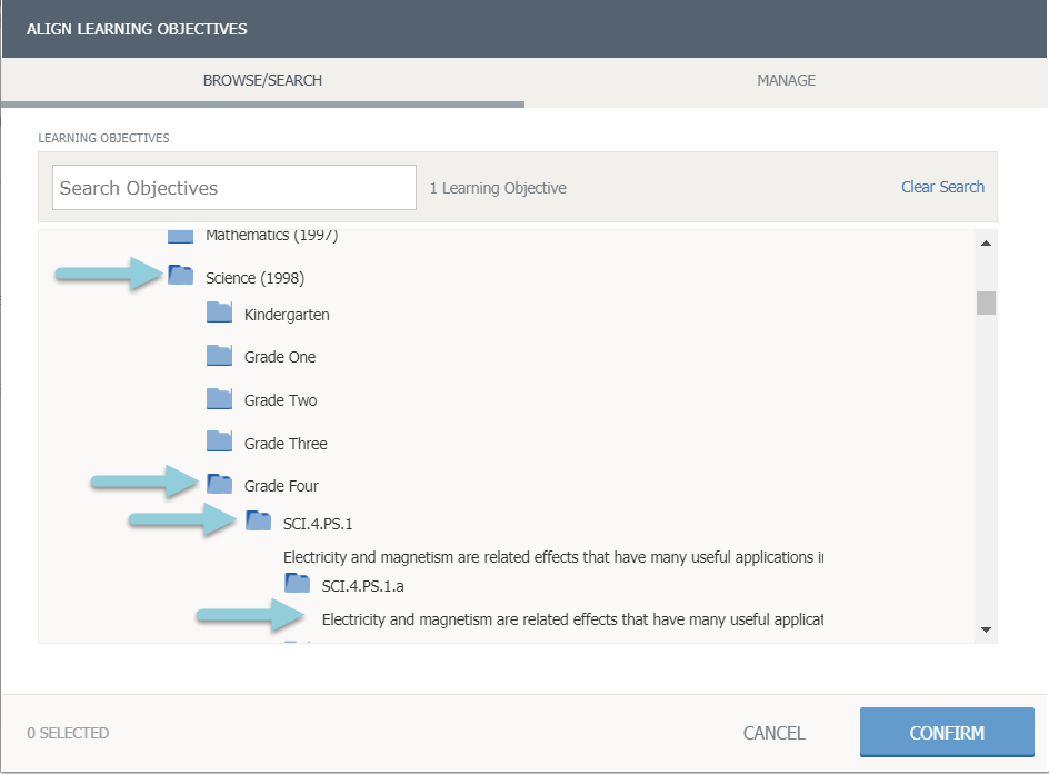 Haga clic en Objetivos de aprendizaje para abrir la ventana del navegador de Objetivos de aprendizaje.