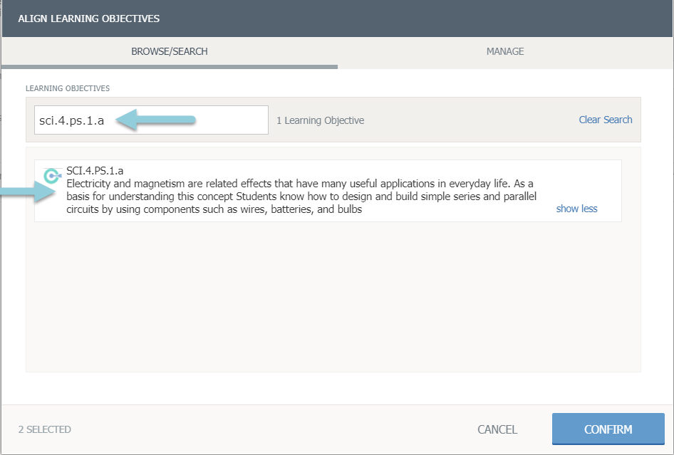 Haga clic en Confirmar para guardar los objetivos de aprendizaje.