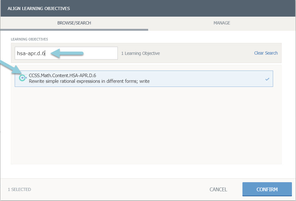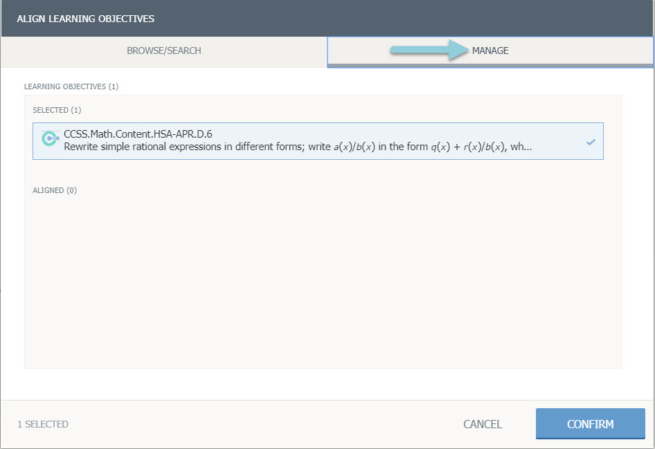 Haga clic en Administrar para encontrar objetivos ya alineados a la pregunta.