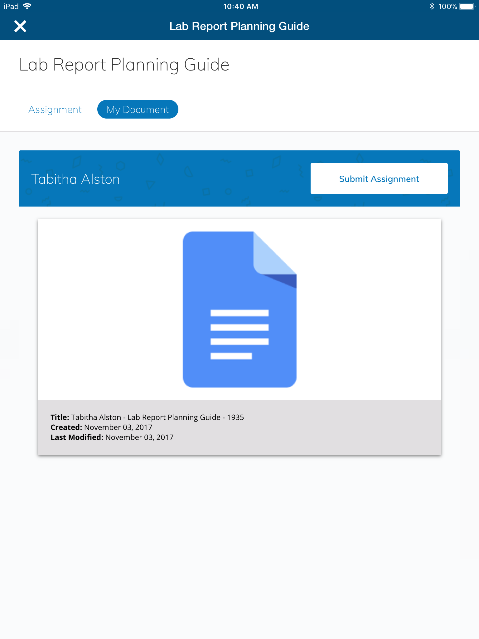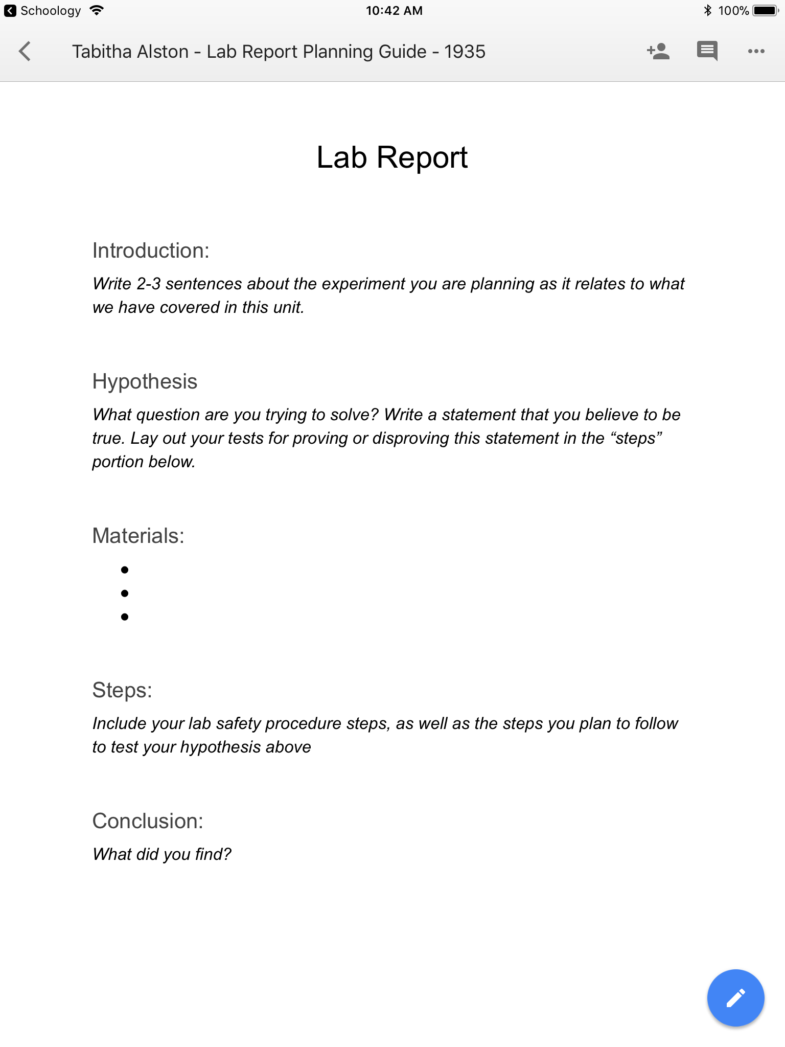 El archivo de la alumna se abrirá en la aplicación Google Docs, donde podrá ver y editar su copia de la tarea. Para volver a la aplicación de Schoology una vez que haya terminado de trabajar y haya guardado su trabajo en Google, puede pulsar el icono de Schoology que se encuentra en la esquina superior izquierda de la pantalla.
