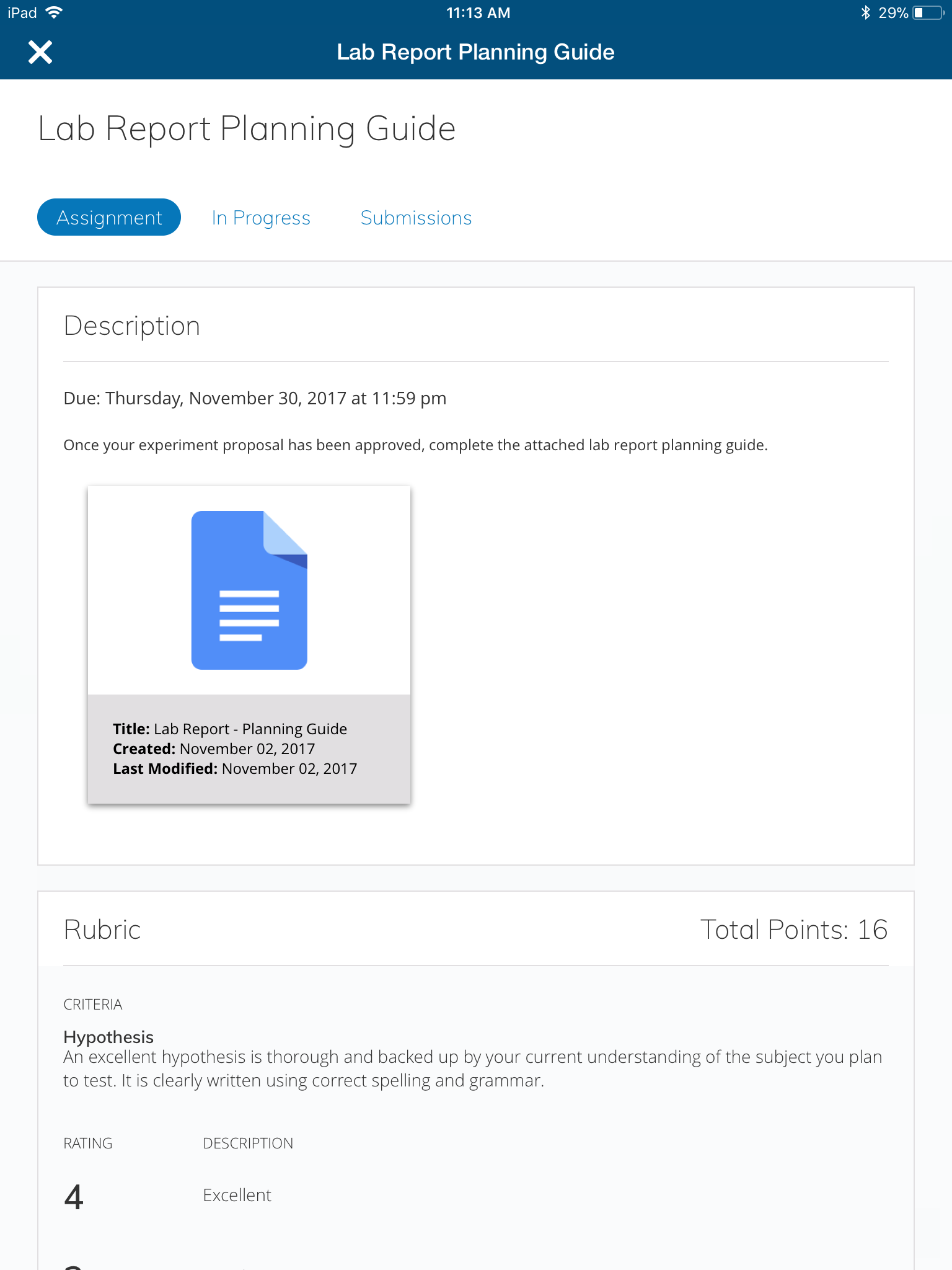 En la aplicación móvil de Schoology, los alumnos pueden acceder a sus tareas e iniciar las aplicaciones de Google Drive que necesiten desde Schoology para crear sus propias copias del contenido en el que deben trabajar y que deben enviar. Luego, el instructor puede hacer comentarios en el Google Doc y calificar la tarea desde su dispositivo iOS o Android.