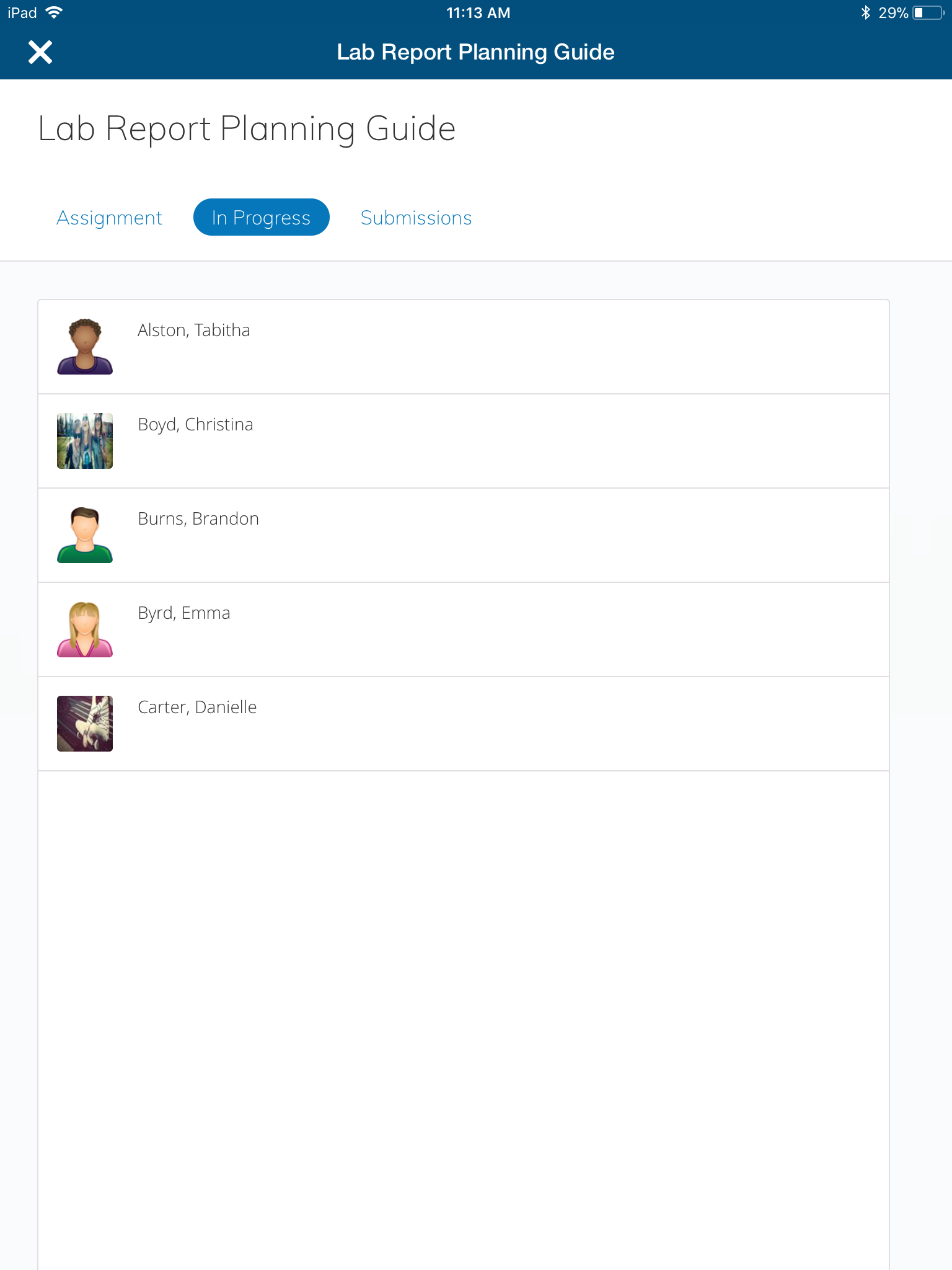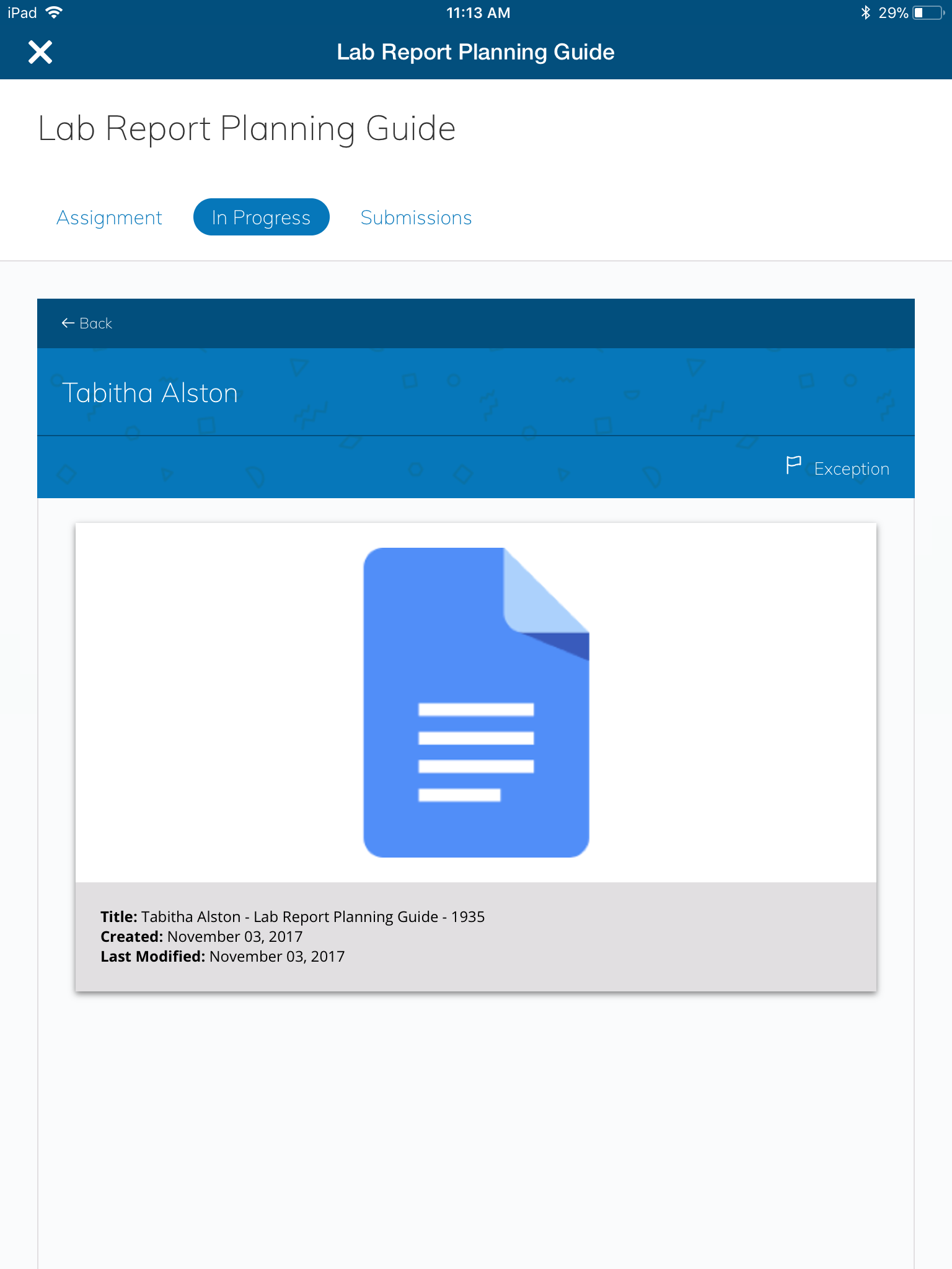 Para abrir el documento de un alumno en la aplicación de Google, puede ir a las pestañas En progreso y Entregas, seleccionar a un alumno de la lista y pulsar su documento.