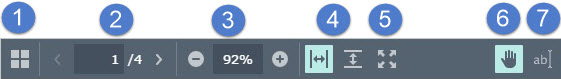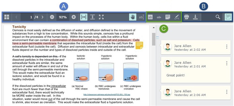 La barra de menú en la parte superior del Visor de documentos está dividida en tres secciones: las secciones A y B están disponibles para todos los usuarios, mientras que la sección C solo está disponible para los educadores que califican y realizan anotaciones en las tareas de los alumnos.